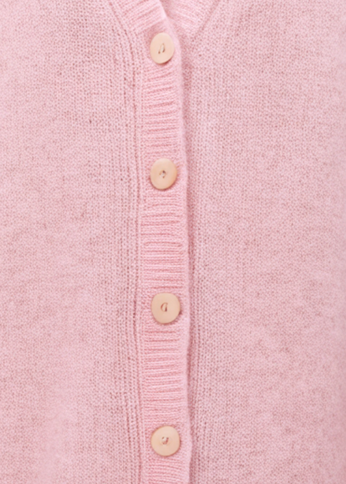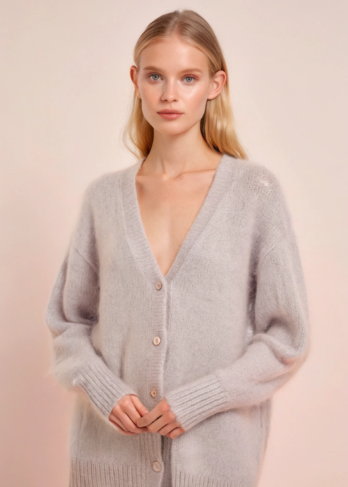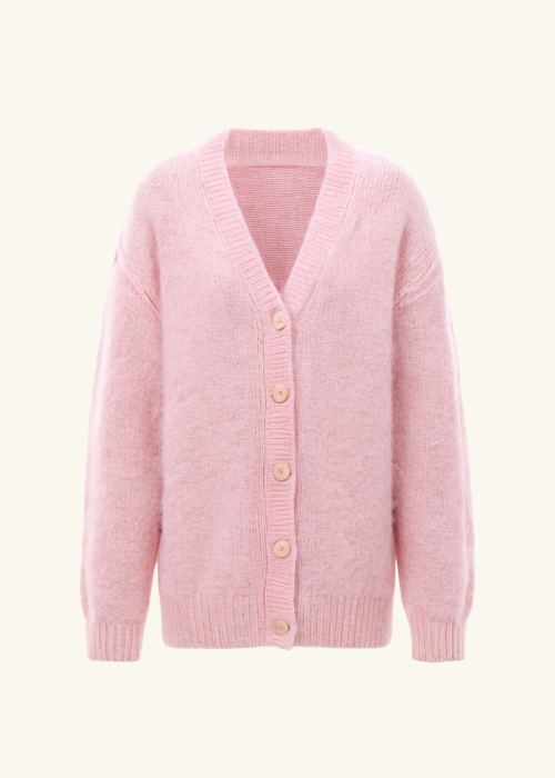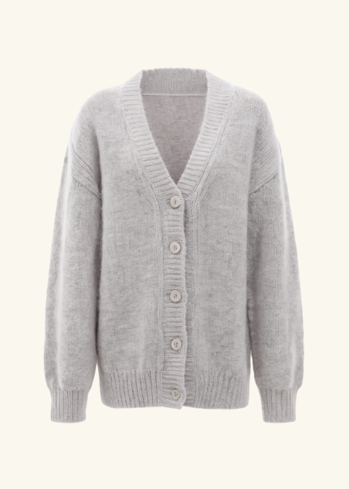 Кардиган из пушистой пряжи с шерстью альпаки. Прямой, свободный силуэт. Расслабленная посадка по фигуре в стиле oversize. Спущенная, мягкая линия плеча. Длинный рукав умеренной ширины. Застежка на пуговицы
